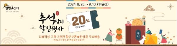올해 별빛촌장터 추석맞이 특별행사는 8월 28일에서 9월 10일까지 2주간 진행되며, 배, 포도, 와인, 전통장류 등 전 상품을 대상으로 무료배송 및 20% 할인행사, 리뷰 작성 시 2천원 할인쿠폰 증정 등 다양한 이벤트로 풍성한 혜택을 제공할 예정이다.