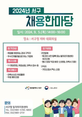 인천 서구는 추석을 앞두고 취업의 어려움을 겪는 구민과 우수인력을 희망하는 기업의 채용지원을 위하여 오는 9월 5일 오후 2시 서구청 지하 대회의실에서'2024년 서구 채용한마당'을 개최한다고 밝혔다.