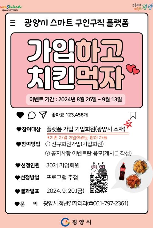 광양시는 관내 모든 공공, 민간 일자리 정보를 한눈에 볼 수 있는 일자리 종합 플랫폼인 ‘스마트 구인구직 플랫폼’ 활성화를 위해 기업회원을 대상으로'가입하고 치킨먹자!'이벤트를 진행한다고 밝혔다.