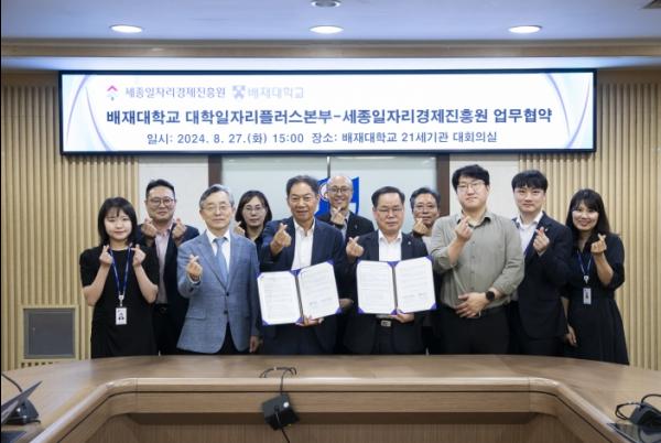 세종일자리경제진흥원과 배재대학교는 지역 청년의 취업역량강화 및 노동시장 진입 지원을 위한 상호 협력을 위해 업무협약을 체결했다.