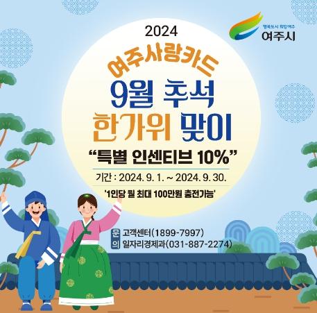 여주시는 9월 추석 한가위를 맞이하여 지역화폐 ‘여주사랑카드’ 인센티브를 상시 인센티브 7%에서 특별 인센티브 10%로 충전한도를 70만원에서 100만원으로 확대 지원한다고 밝혔다.