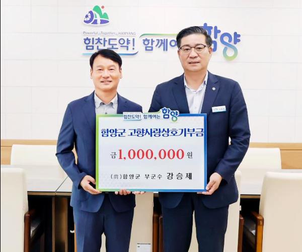 경남 함양군 부군수를 역임했던 강승제 전 부군수가 27일 오후 함양군청을 방문하여 함양군 발전을 염원하며 고향사랑기부제 100만 원을 기탁했다.