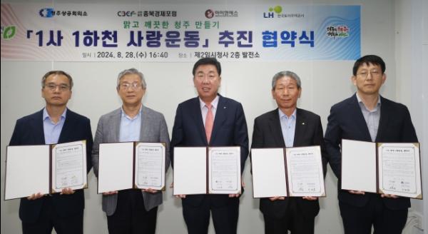 청주시는 28일 제2임시청사 발전소에서 청주상공회의소, ㈔충북경제포럼, ㈜아이앤에스, LH한국토지주택공사 충북지역본부 등 4개 기관 및 기업과 ‘1사 1하천 사랑운동’추진을 위한 협약을 체결했다.
