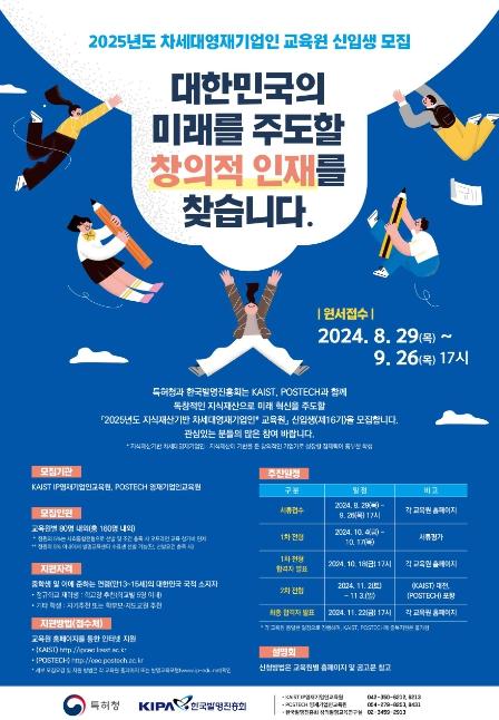 특허청은 카이스트(KAIST), 포스텍(POSTECH)과 함께 8월 29일~9월 26일 17시까지 '2025년도 지식재산기반 차세대영재기업인 교육원' 신입생(제16기)을 모집한다.