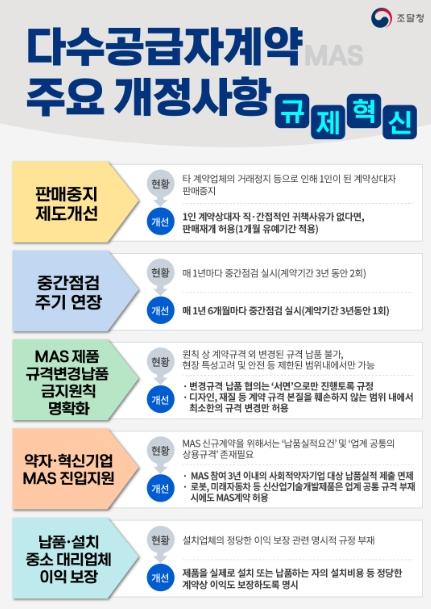 조달청은 ‘조달기업의 입장에서, 조달기업의 눈’으로 킬러규제는 과감히 혁파하여 기업부담은 경감하고 제도운영의 효율성은 높이는 방향으로 '물품 다수공급자계약 관련 행정규칙 2종'을 개정하여 8월 29일부터 시행한다.