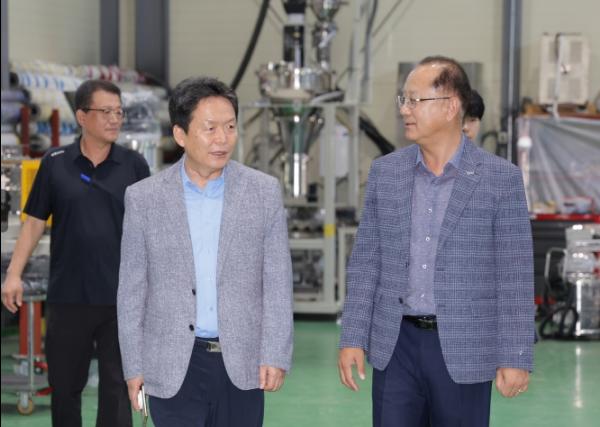 청주시 기업애로해소지원단 단장인 신병대 청주부시장이 29일 청원구 사천동에 위치한 양극재 설비 제조업체 ㈜삼밀을 찾아 송진환 대표 등 관계자와 대화 시간을 가졌다.