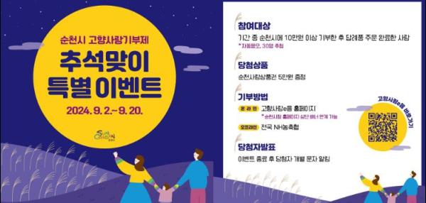 순천시가 추석을 맞아 오는 9월 2일부터 20일까지“순천 고향사랑기부제 추석맞이 특별 이벤트”를 진행한다.