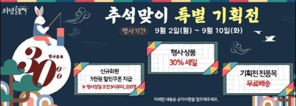 의령군은 9월 2일부터 10일까지 의령군 공식 쇼핑몰 ‘토요애’에서 민족 최대의 명절 추석을 맞아 전 행사상품 30% 농특산물 할인 이벤트를 추진한다고 밝혔다.