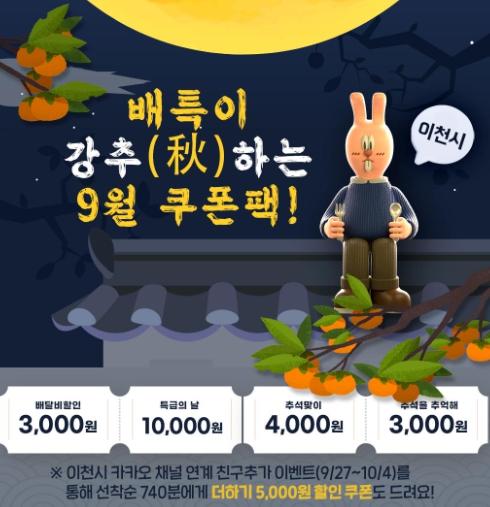 30일 이천시에 따르면 9월 배달특급은 ▲‘주말엔 특급 프로모션’(금,토,일) 3천 원 쿠폰 ▲‘추석 맞이’(둘째 주) 4,000원 쿠폰 ▲‘추석을 추억해’ (넷째 주) 3,000원 쿠폰 ▲‘이천시 카카오톡 플러스 친구’(마지막 주) 5,000원 쿠폰을 각각 선착순으로 지급할 예정이다. 또한 고정 이벤트인 ▲배달특급의 날(매달 세 번째 금요일) 5천 원을 1만 원 할인으로 파격 상승하여 선착순 지급 ▲배달비 최대 3천 원 할인쿠폰을 지급할 예정이다.