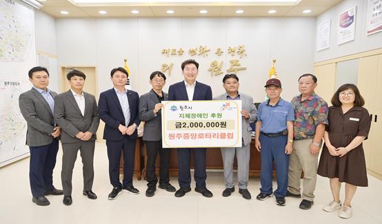 원주중앙로타리클럽은 이달 30일 원주시장 집무실에서 지체장애인협회 원주시지회에 후원금 200만 원을 전달했다.