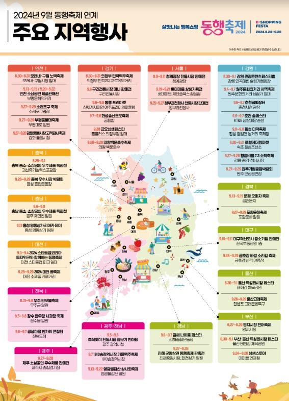 동행축제 기간(8.28~9.28)에 펼쳐지는 할인행사와 다양한 지역축제 및 판촉행사 정보는 동행축제 누리집에서 확인할 수 있다.
