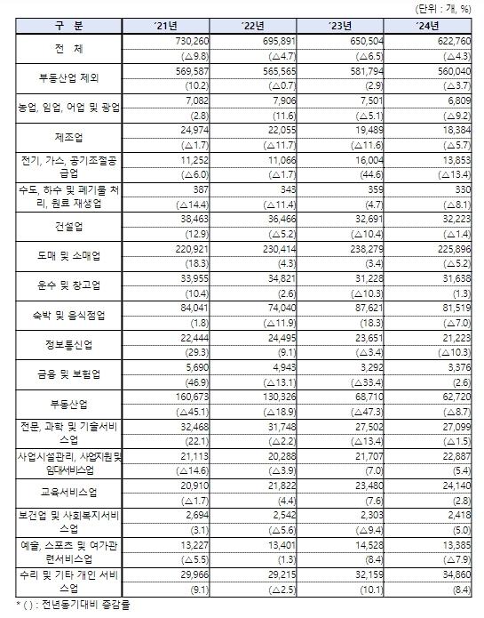 2024년 상반기 창업은 돌봄 ? 간병, 교육 등 관련 수요가 확대되고 있는 업종을 중심으로 증가했으나, 글로벌 경기둔화 여파 등으로 전체적으로는 전년대비 4.3%(27,744개) 감소한 62만 2,760개로 집계됐다.
