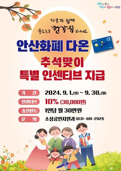 안산시는 추석 명절을 맞아 9월 한 달 동안 안산 지역화폐 다온의 ‘특별 인센티브’를 지급한다고 31일 밝혔다.