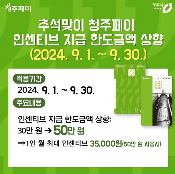 청주시는 민족 대명절인 추석을 맞이해 9월 한 달 간 청주페이 인센티브 지급 한도금액을 기존 30만원에서 50만원으로 상향 지원한다고 31일 밝혔다.