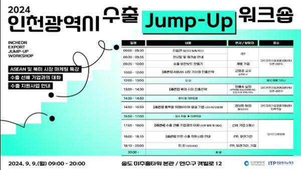 인천테크노파크(인천TP)와 인천시는 중소기업 수출 활성화를 위해 오는 9일 송도 미추홀타워에 있는 인천기업경영지원센터에서 ‘수출 Jump-Up 워크숍’을 개최한다.