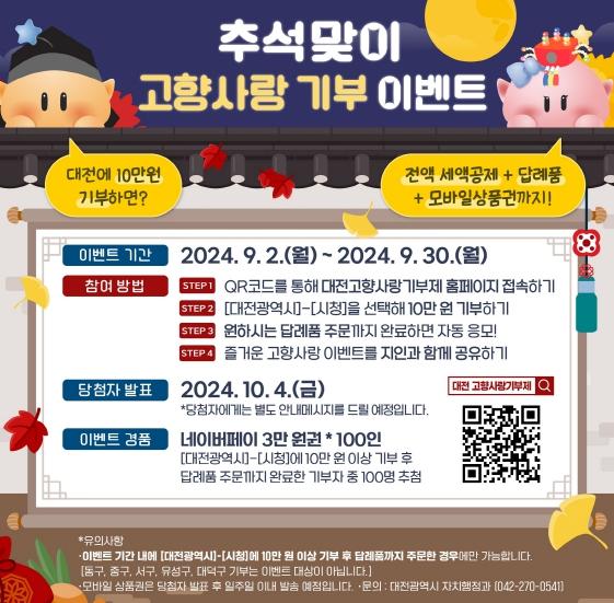 대전시는 민족 대명절 추석(9.17)이 있는 9월을 맞아 9월 2일부터 30일까지 한 달간“대전 고향사랑기부 경품 이벤트”를 진행한다.