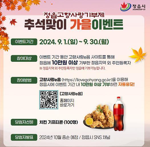정읍시는 다가오는 추석 명절을 맞아 ‘고향사랑기부제 추석맞이 가을이벤트’를 진행한다.
