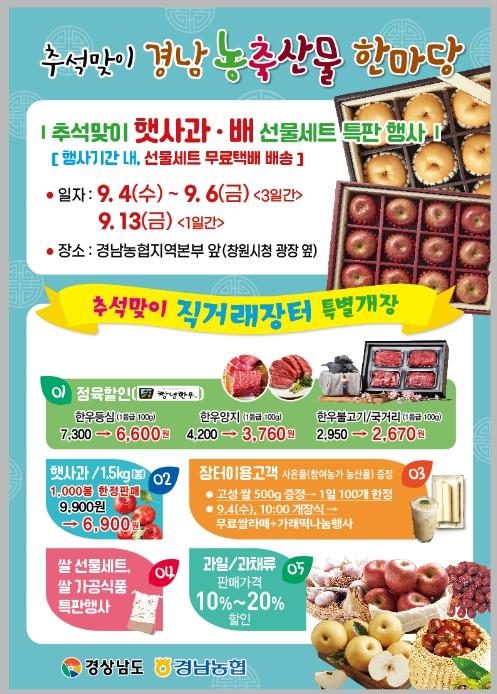 또한, 9월 11일부터 12일까지 이마트창원점 앞 장터에서는 명절떡 나눔행사와 구매액에 따라 5천 원, 2만 원 상당의 농산물꾸러미를 증정한다.