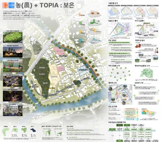농촌계획 부문 대상은 충북 보은을 대상으로 주민 인터뷰를 통해 마을주민이 필요로 하는 요소를 파악 후 마을의 지속가능성과 농촌에 필요한 삶터, 일터, 쉼터를 계획한 'BE 농(農)+TOPIA : 보은'작품이 차지했다.