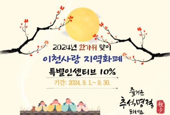 이천시는 9월 1일부터 한 달간 최대명절인 한가위를 맞이하여 경기이천사랑지역화폐 인센티브 할인율을 10%로 일시 상향한다고 밝혔다.