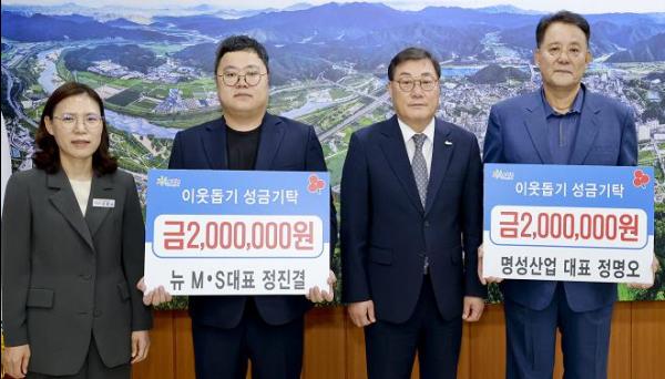 정명오(명성산업 대표)?정진결(뉴M?S 대표) 부자는 2일 합천군청을 방문해 추석을 맞아 이웃돕기 성금으로 각각 200만 원씩, 총 400만 원을 기탁했다.