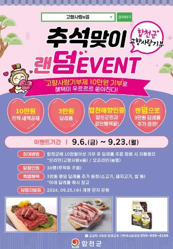 ‘추석맞이 랜“덤”이벤트’는 합천군에 10만 원 이상 고향사랑기부를 한 사람 중 무작위로 30명을 추첨하여, 3만 원 이하의 답례품을 랜덤으로 추가 증정하는 행사다.