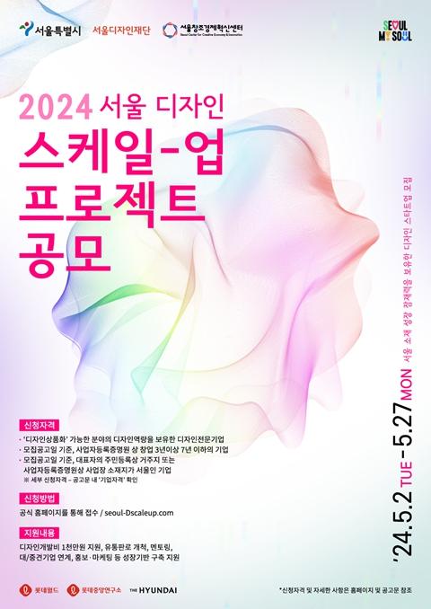 '2024 서울 디자인스케일업 프로젝트'는 성장형 디자인 스타트업을 발굴하고 육성하여 스케일업을 도모하는 프로젝트로 대·중견기업과의 협력, 컨설팅, 교육, 디자인 개발 등을 지원하여 디자인 전문기업을 육성하는데 목표를 두고 있다.