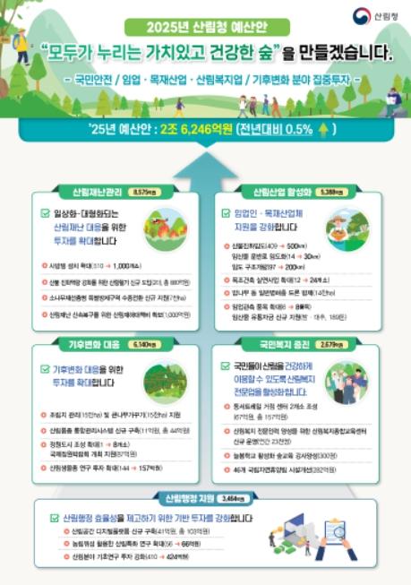 산림청은 2025년 예산안이 2024년 대비 0.5%(+120억 원) 증가한 2조 6,246억 원 규모로 편성됐다고 3일 밝혔다.