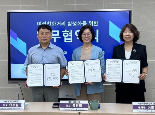 세종시사회서비스원에서 운영하는 세종여성플라자는 2일 새롬동 주민자치회, 세종여성새로일하기센터와 새롬동 여성친화거리 활성화를 위한 업무협약을 체결했다.