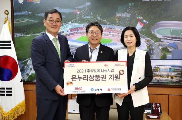 김해시는 3일 BNK금융그룹에서 추석을 맞아 어려운 이웃을 위해 써 달라며 3,000만원 상당의 온누리상품권을 기탁했다고 밝혔다.