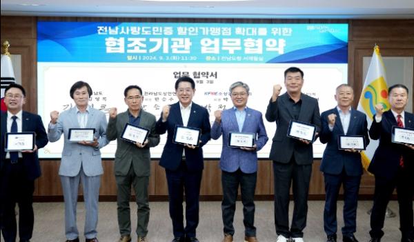 전라남도는 3일 도청 서재필실에서 전남도 상인연합회 등 7개 단체와 전남 사랑애(愛) 서포터즈 서비스 강화를 위한 전남사랑도민증 할인가맹점 확대 업무협약을 했다.