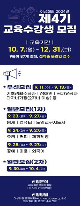 부산시 여성회관은 시민들의 취업, 창업 등 경제활동 참여와 직장인 등의 능력개발을 위해 '2024년 제4기 교육과정' 수강생을 오는 9월 11일부터 모집한다고 밝혔다.