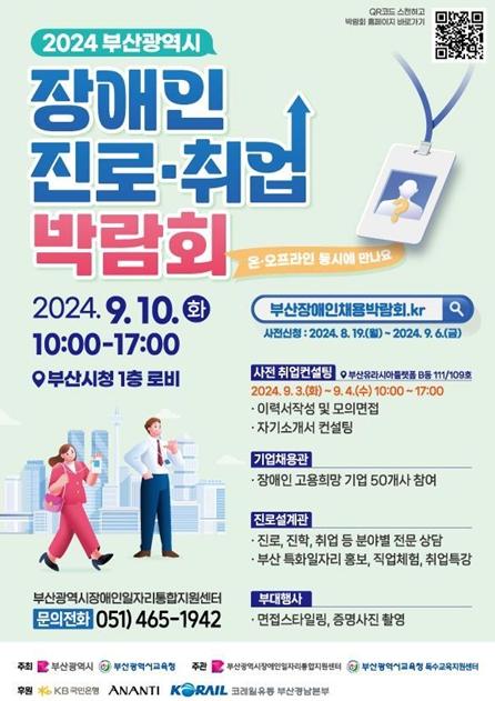 부산시는 오는 9월 10일 오전 10시부터 오후 5시까지 시청 1층 로비, 대회실, 대강당 등에서 '2024 부산 장애인 진로?취업 박람회'를 개최한다고 밝혔다.