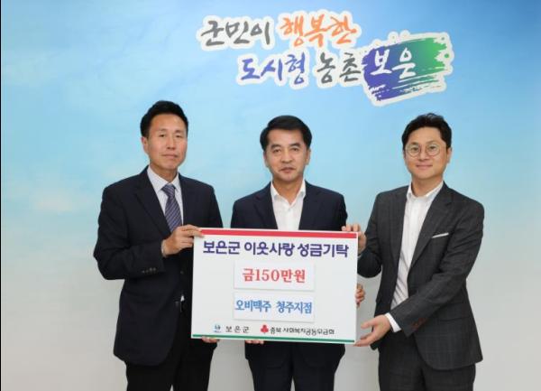 오비맥주 청주지점은 4일 보은군청을 방문해 다가오는 추석 명절 저소득 소외계층을 위해 써 달라며 현금 150만 원을 기탁했다.