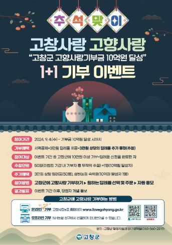고창군은 추석명절을 맞이해 고향사랑기부제 홍보와 모금액 확대를 위해 4일부터 모금액 10억원 달성 시까지 '추석맞이 고창군 고향사랑기부제 1+1 이벤트'를 진행한다.