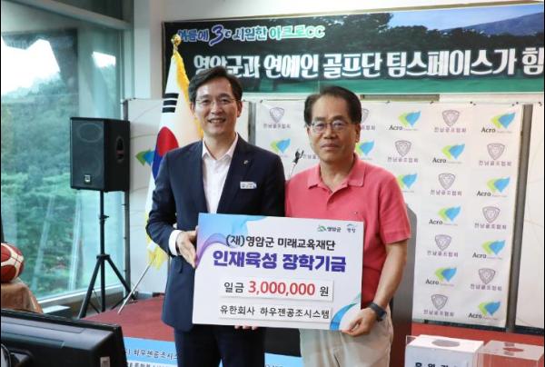 하우젠공조시스템이 8/29일 영암 아크로CC에서 (재)영암군미래교육재단에 인재육성기금 300만원을 기탁했다.