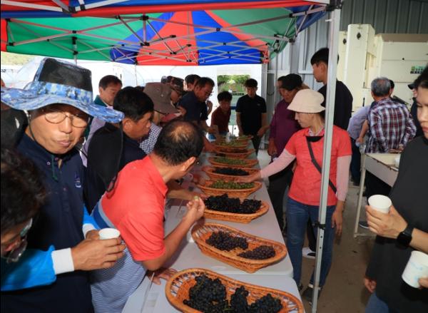 진안 친환경 포도 연구회가 주관한 이번 품평회에서는 진안 맞춤형 유럽종 포도 재배시설 시범사업 등 2개 사업을 3년간 10.4억원(도비 0.9, 군비 9.5)을 투입해 유럽종 포도 하우스 2.5ha를 조성함에 따라 시설을 둘러보고, 샤인머스켓, 뉴써틴, 베니바라드, 알렉산드리아, 함부르크, 허니비너스, 블랙사파이어, 슈튜벤, 캠벨, 주얼리머스켓 등 10종의 포도의 특성 설명과 시식 기회가 제공됐다.