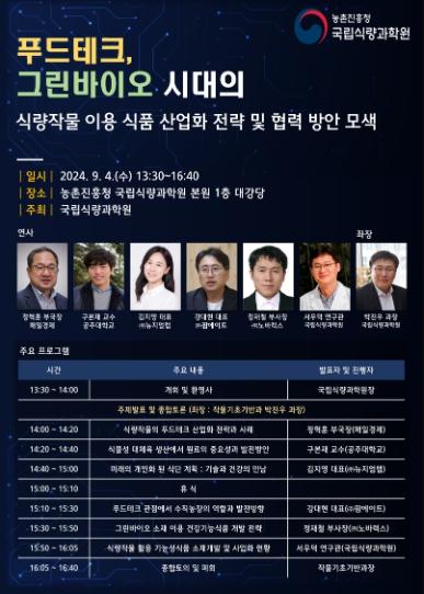 발표 주제는 △식량작물의 첨단 식품 기술(푸드테크) 산업화 전략과 사례 △식물성 대체육 생산에서 원료의 중요성과 발전 방안 △미래 개인화된 식단 계획 △첨단 식품 기술(푸드테크) 관점에서 수직농장의 역할과 발전 방향 △친환경생명공학(그린바이오) 소재 이용 건강기능식품 개발 전략 △식량작물 활용 기능성 식품 소재 개발 및 사업화 현황이다.