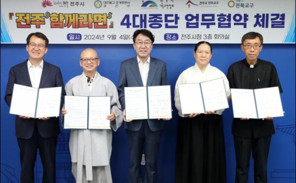 전주시와 대한불교 조계종 제17교구 본사 금산사, 전주시기독교연합회, 천주교 전주교구, 원불교 전북교구는 4일 시청 3층 회의실에서 우범기 전주시장과 전주지역 4대 종단 대표들이 참석한 가운데 사회적 고립 예방 사업인 ‘전주 함께라면’ 운영 활성화와 지역 내 위기가구 발굴을 위한 업무협약을 체결했다.