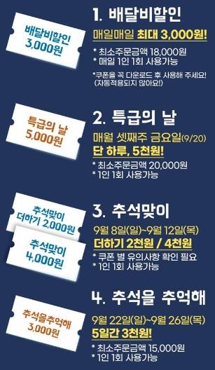 오는 9월 ▲셋째 주 금요일(9. 20.) 5,000원 쿠폰을 제공하는 ‘부천시 특급의 날’ ▲3,000원 쿠폰을 제공하는 ‘배달비 지원’ ▲4,000원 쿠폰과 더하기 2,000원 쿠폰을 제공하는 ‘추석맞이 지원’ ▲‘추석을 추억해’ 3,000원 등 다양한 혜택이 마련되어있다.