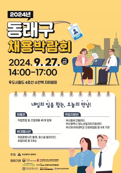 부산 동래구는 오는 9월 27일 오후 2시부터 5시까지 도시철도 4호선 수안역 지하광장에서 취업을 희망하는 청년, 중장년 등 전 연령층을 대상으로“내일을 꿈꾸며 내 일을 찾는 2024년 동래구 채용박람회”를 개최한다고 밝혔다.