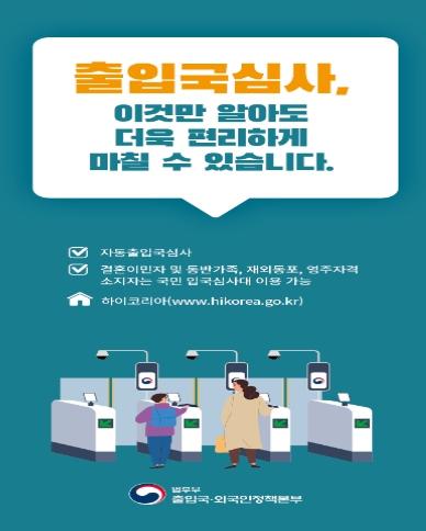둘째, ‘외국인등록 또는 거소신고를 한 17세 이상의 외국인’은 사전등록 없이 입·출국 시 자동출입국 심사대 이용이 가능(7세 이상 17세 미만은 사전등록 필요)하며, ‘입국 시 지문과 얼굴 정보를 제공한 17세 이상의 외국인 관광객’은 출국 시 자동출입국 심사대를 이용할 수 있다.
