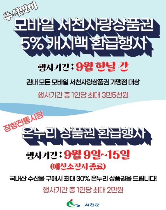 서천군은 민족 대명절인 추석을 맞아 9월 한달간 모바일(카드) 서천사랑상품권 5% 캐시백 행사를 실시한다.