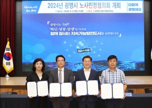 광명시는 5일 시청 대회의실에서 광명시 노사민정협의회를 열어 지속가능한 자족도시로의 대전환을 이루기 위한 노사민정 공동선언을 선포하고 협력을 다짐했다.