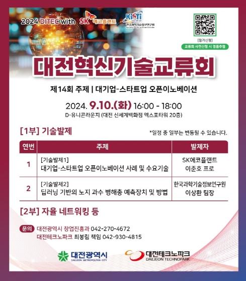 신청은 네이버폼 또는 포스터 상단 QR코드로 가능하며, 자세한 문의는 대전테크노파크 기술사업화팀으로 하면 된다.