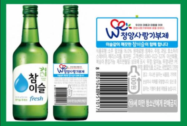 청양군이 하이트 진로와 협업해 참이슬 소주병에 ‘청양사랑기부제’ 홍보 라벨을 부착하고 9월부터 전국에 15만 병을 유통한다고 밝혔다.