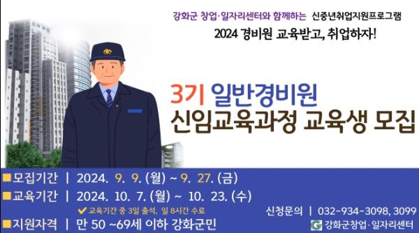 강화군 창업·일자리센터가 오는 9일부터 27일까지 신중년 맞춤형 일자리 사업인 일반경비원 신임교육 3기 교육생을 모집한다고 밝혔다.