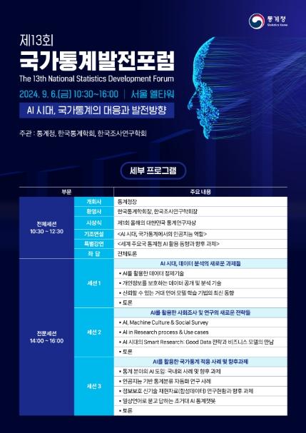 통계청은 '제13회 국가통계발전포럼'을 9월 6일 서울 엘타워에서 한국통계학회(회장 김동욱), 한국조사연구학회(회장 서우석)와 공동으로 개최했다.