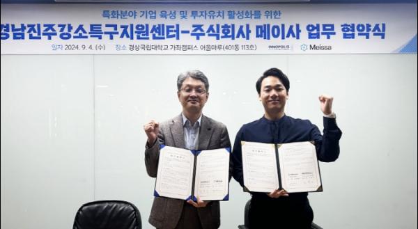 경상국립대학교 경남진주강소특구지원센터(센터장 문용호 항공우주공학부 교수)와 주식회사 메이사(대표 김동영)는 9월 4일 가좌캠퍼스 어울마루에서 특화 분야 기업 육성 및 투자유치 활성화를 위해 지속적 협력을 약속하는 업무협약을 체결했다.