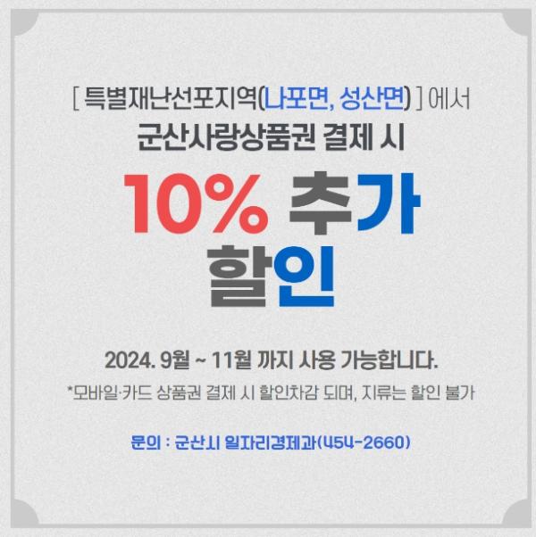군산시는 특별재난지역으로 선포된 나포면과 성산면에서 9월부터 11월까지 군산사랑상품권을 사용하면 10% 추가 할인을 받게 된다고 밝혔다.